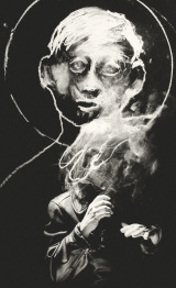 beugt er sich über schwarze Kartonbögen und zeichnet darauf mit weißer