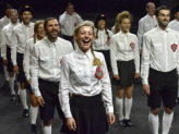 Internatsuniformen gekleideten Performer stellen sich in zwei Reihen auf.
