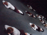 Unterwäsche bekleideten Jugendlichen in zwei Reihen auf dem Boden von